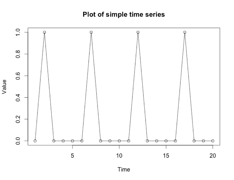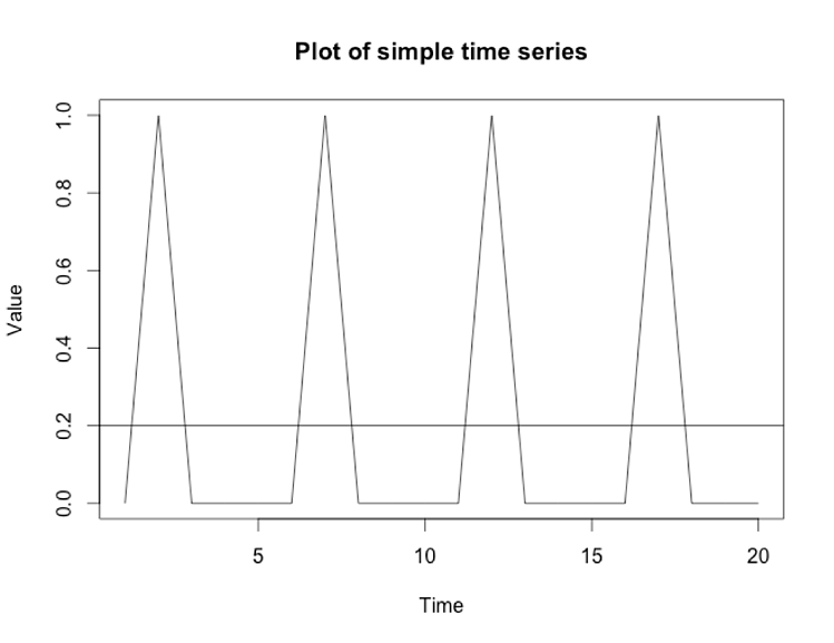The pattern is obvious: the plot repeats the values [0, 1, 0, 0, 0]. Can you tell me what the next five values are going to be? Of course you can, because I just told you! They are [0, 1, 0, 0, 0]. What would it look like if we made the values relative to the average of those five points? The average of (0+1+0+0+0)/5 is 0.2, which we’ll draw on the plot as a horizontal line: