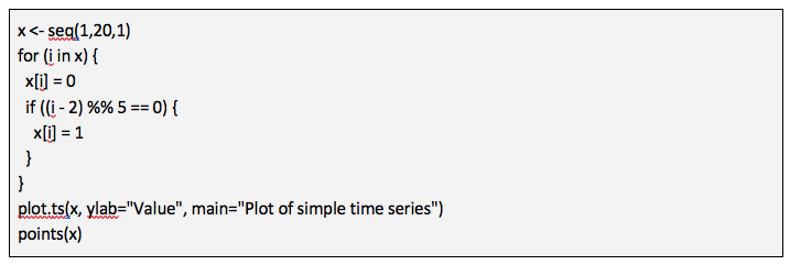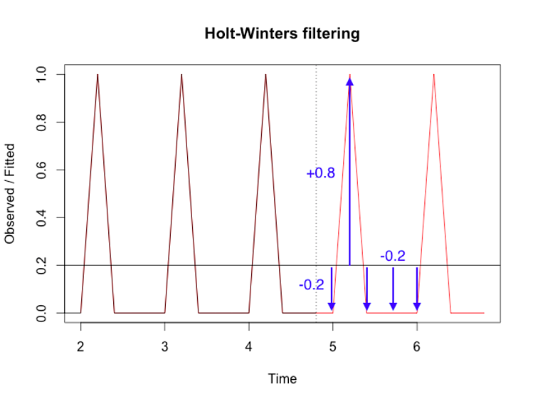 Holt-Winters has a trend component. If we set its parameter to zero, Holt-Winters ignores the trend (slope), so the model simplifies. Now, it’s just a bunch of values relative to the average. In our plot, the values relative to 0.2 are [-0.2, 0.8, -0.2, -0.2, -0.2]. If we did Holt-Winters without trend, that’s the type of model we’d build. Here’s what the Holt-Winters function in R gives, with some annotations in blue I added manually: