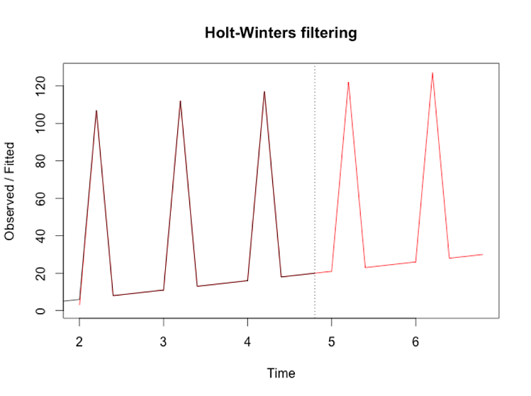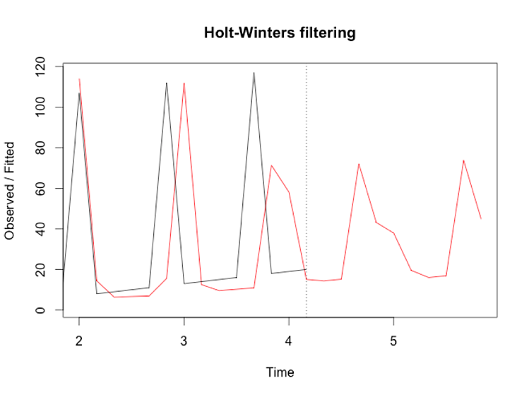 The forecast, which is the red line in the chart, becomes less accurate and turns into garbage. To get good results, you need to give the model good parameters. This is the second challenge with Holt-Winters forecasting.