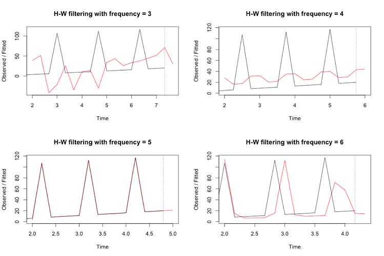 The one with the right seasonality (five periods per season) is easy to pick out visually because the differences between the data and the forecast are small. This is a visual example of what our forecasting does through optimization. It also optimizes other parameters, such as the trend.