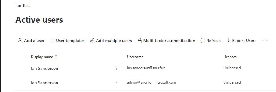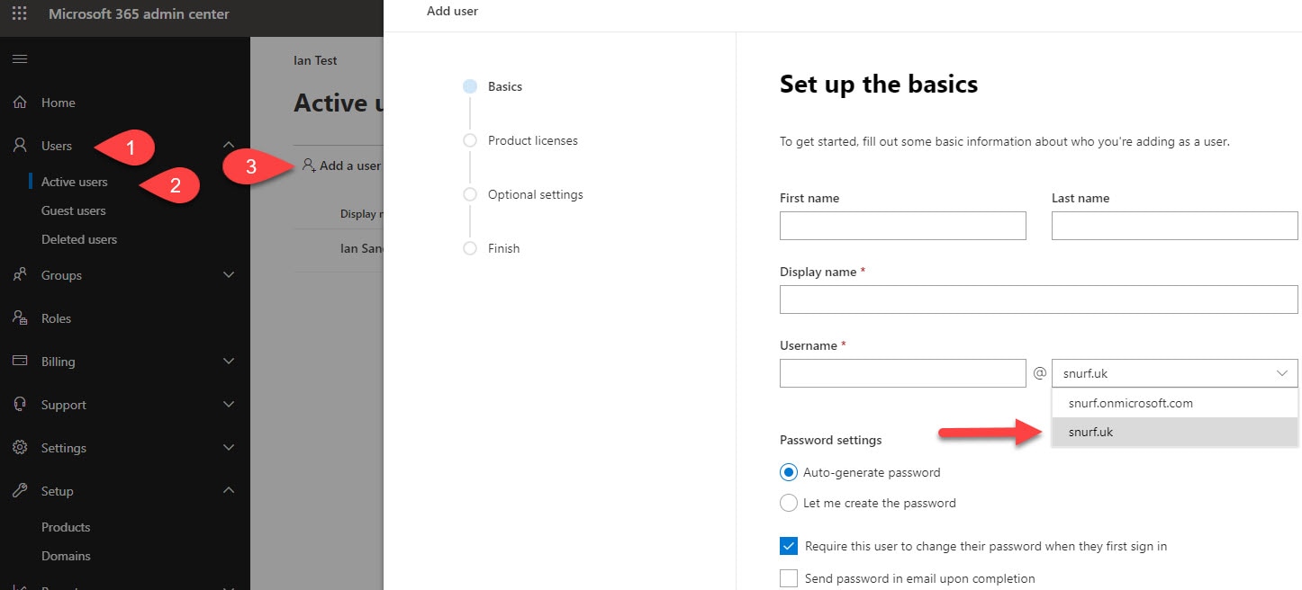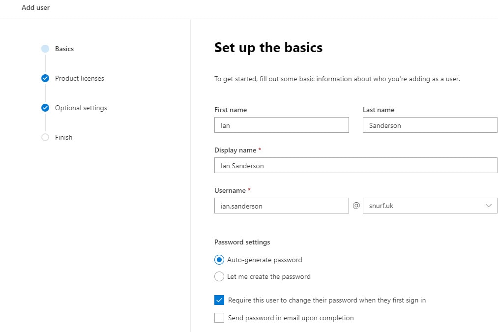 There are a couple of ways to create users in an O365 portal. They can be synchronized from an external source like an on-premises Active Directory, or they can be manually created on the O365 portal. I’ll show the latter here. Click Users, Active users, Add a user. Notice snurf.uk is now an option for the domain suffix.