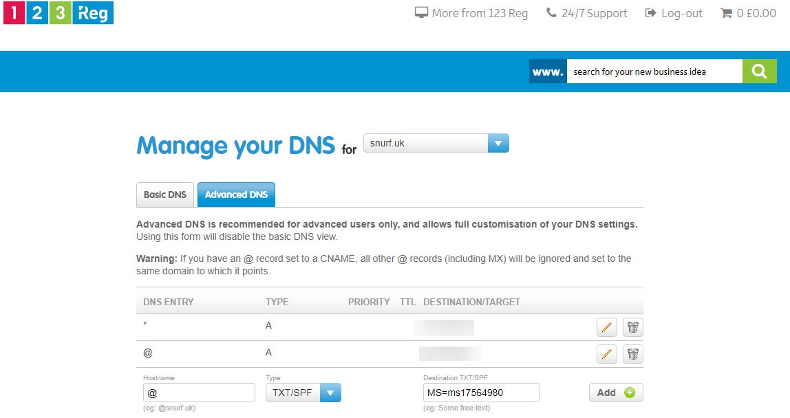 On the 123-reg portal, it looks like this. It’ll be similar for your DNS hosting provider.