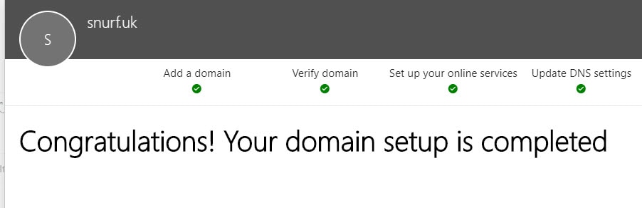 I’m going to add and verify the domain snurf.uk. This O365 portal will be deleted before this article is published.
