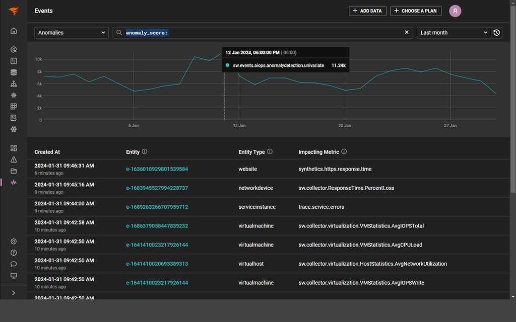 Analise padrões de eventos em tempo real com visualizações. Detecte alterações no volume de mensagens com antecedência para solucionar problemas de modo eficaz. Use tagging para monitoramento de sistemas críticos. Acelere a resolução de problemas com a análise AIOps de eventos circundantes.